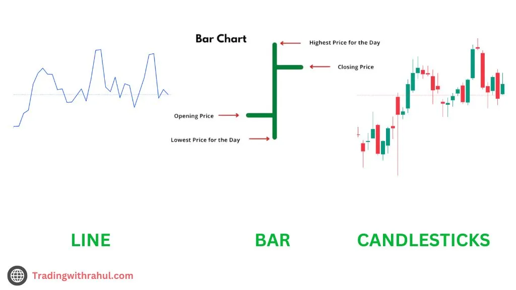 स्टॉक चार्ट के कई प्रकार होते हैं, लेकिन तीन मुख्य प्रकार हैं जो सबसे ज्यादा उपयोग किए जाते हैं: